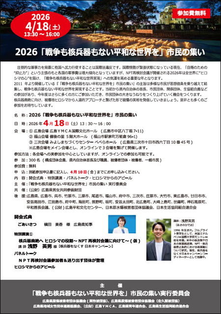4月18日(土)、2026「戦争も核兵器もない平和な世界を」市民の集いを開催します。詳細はチラシをご確認ください。